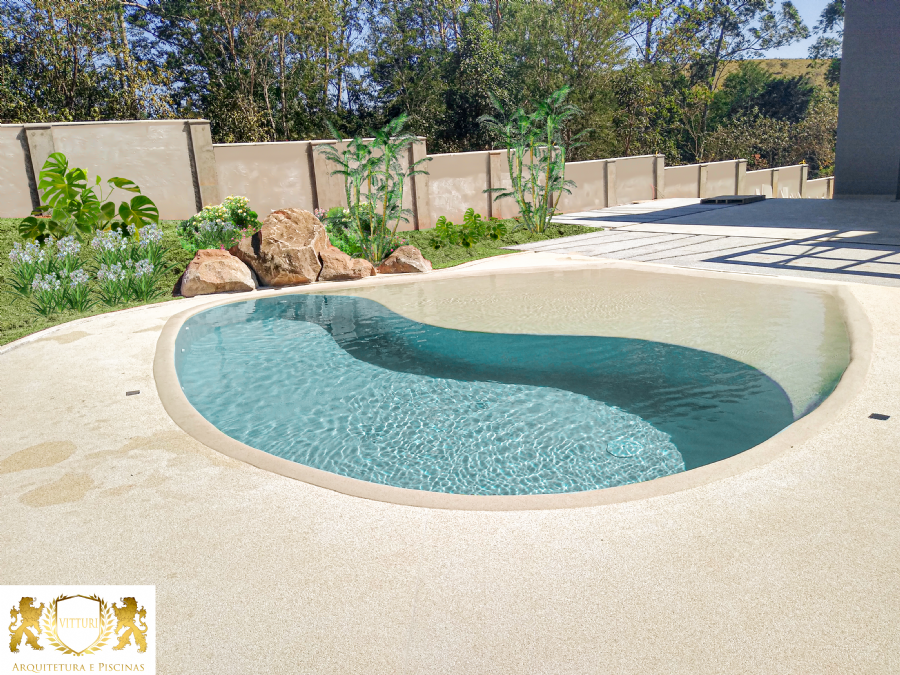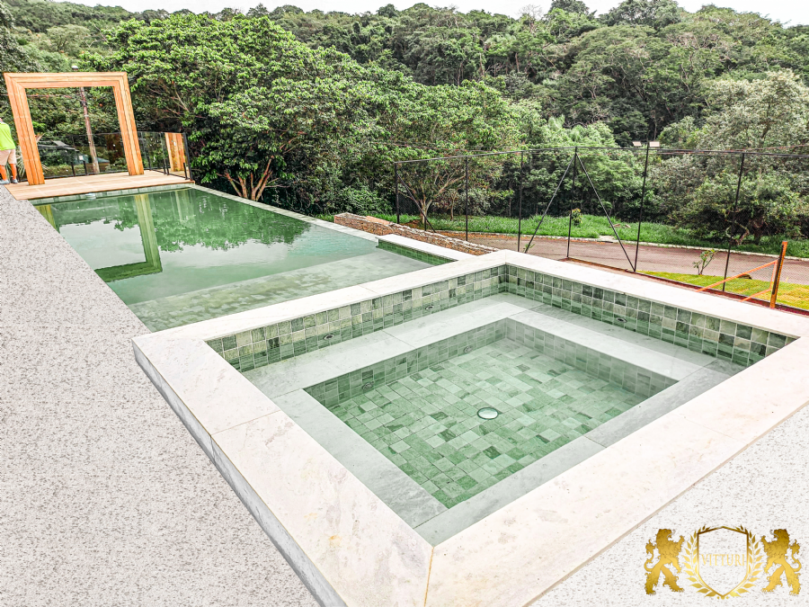 Paisagismo e Entorno: A área ao redor da piscina é finalizada com paisagismo, pavimentação e mobiliário, criando um espaço atraente e funcional.